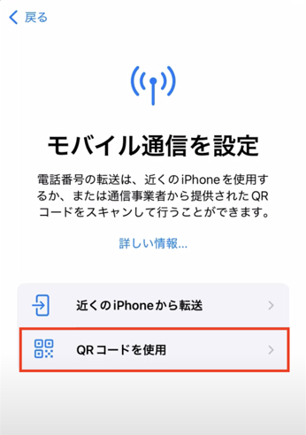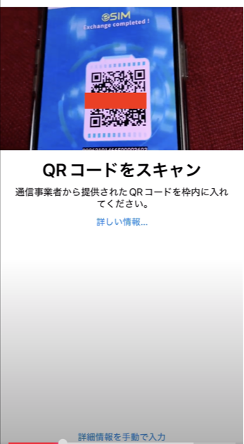 *このQRコードは、eSIM追加の行程で読み取る必要があります(それ以外のカメラやQRコードリーダーなどで読み取ると、手動で有効にする際のコードが表示されるのみ)