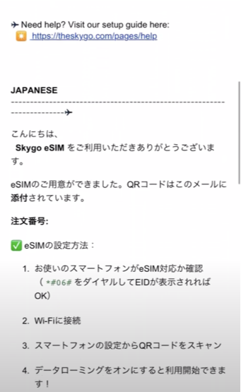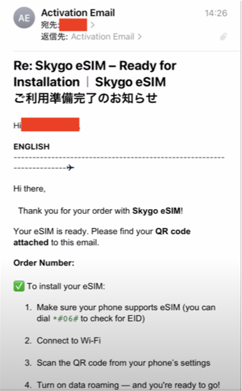 購入したeSIMのインストールの準備が整うと『Activation Email』が届きます。