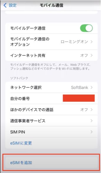 *上部にSoftbankのSIMカードで利用している通常利用している内容がありますが、eSIMの追加のために削除する必要はありません。eSIMは、このようなSIMと併用しての利用が可能です。