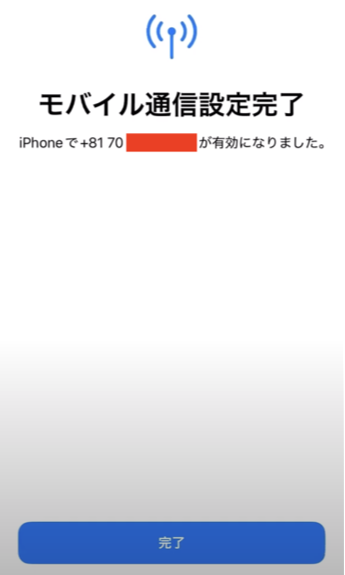 モバイル通信設定完了の表示が出ればeSIMは利用可能になります(データのみのeSIMでも電話番号が表示されるのは、通話はできなくてもSMSの受信などができる番号は割り振られるため。)