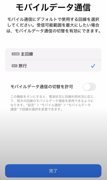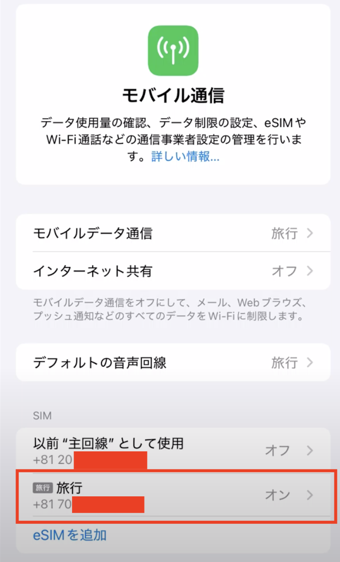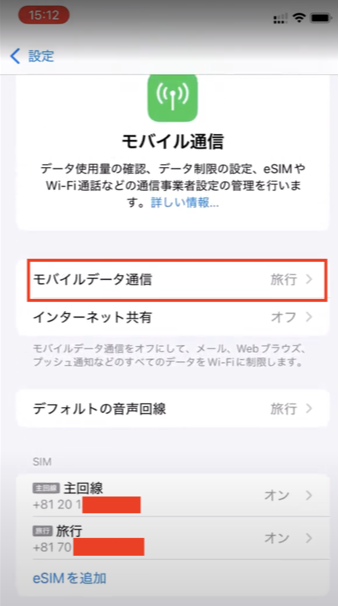 モバイルデータ通信の項目は、特に利用する現地に入った際には、利用するeSIMに切り替えましょう。